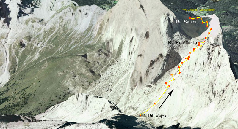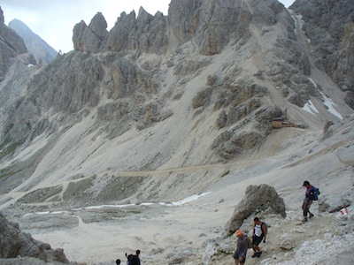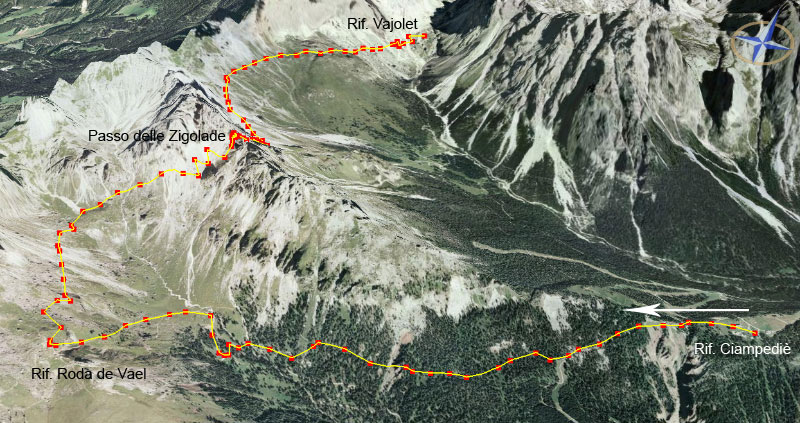 giovedì 3: arrivo a Vigo di Fassa e salita con la funivia del Ciampedie (1997 mt), poi sentiero fino al Rifugio Roda de Vael (2280 mt), salita al Passo delle Zigolade (2550 mt) e discesa al rif. Vajolet (2243 mt) dove pernotteremo per 3 giorni.