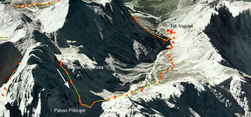 venerdì 4: bellissimo e faticoso giro attorno al massiccio dell'Antermoia, oltrepassando l'ormai leggendario canalone sui Dirupi di Larsech (2500 mt) e giungere alla valle omonima, da qui risalita fino al passo di Lausa (2700 mt) e discesa al Rifugio Antermoia (2495 mt) dove pranzeremo. Dopo la pausa risaliamo al Passo Antermoia (2770 mt) e torniamo al Rifugio Vajolet passando dal Passo Principe (2599 mt)